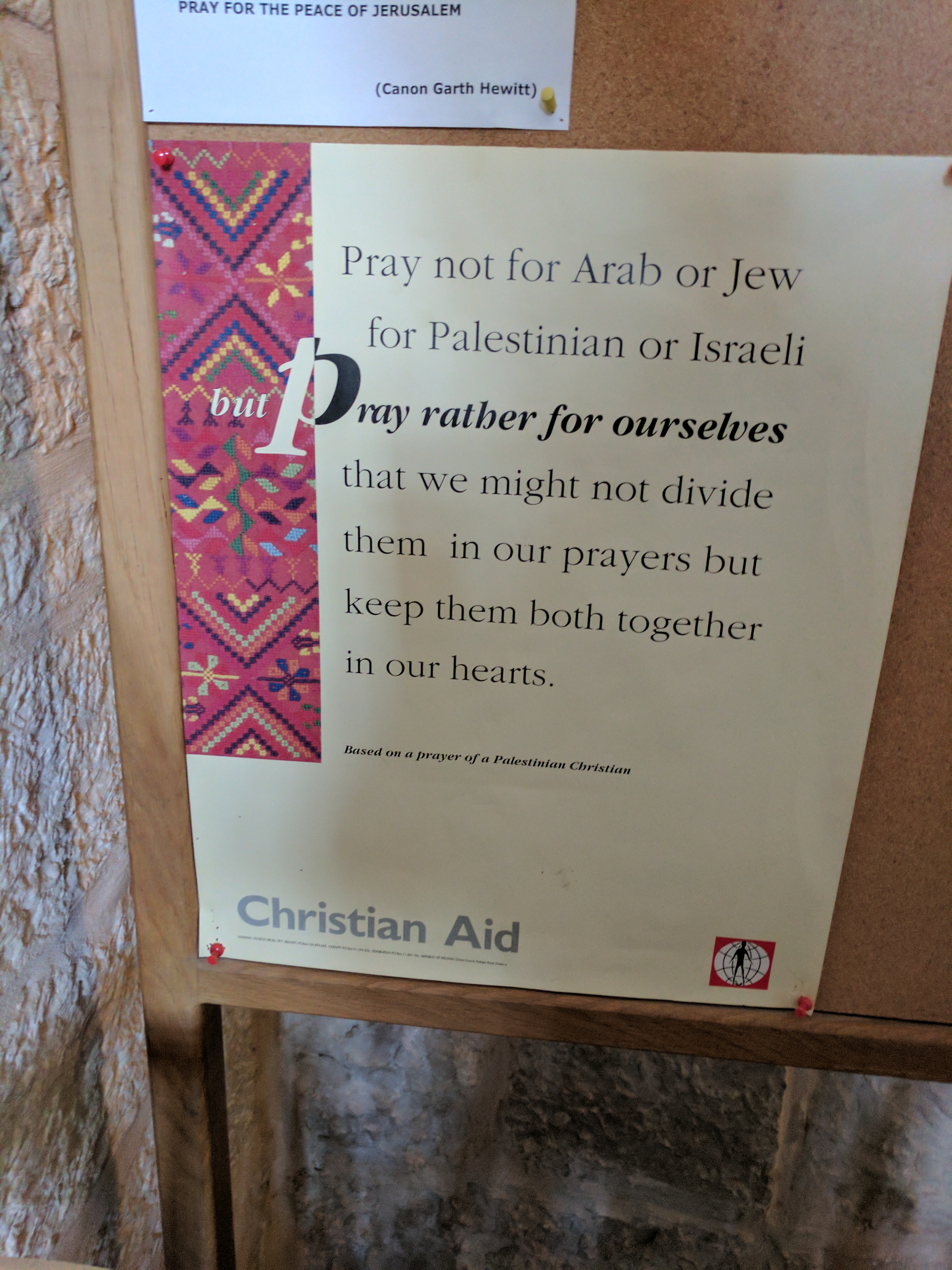 As we begin our last full day in Israel/Palestine I figured I'd catch up with updates. I pray that everyone had a wonderful Pentecost. We visited an Episcopal Church in Jerusalem to worship for Pentecost. I was an amazing service done in both Arabic and English. It was truly a blessing. I included a picture of a poster I found in the sanctuary there. We had the rest of the day off so I was able to do some shopping and sightseeing on our own. In the evening, my roommate and I went to the Wailing Wall to pray.